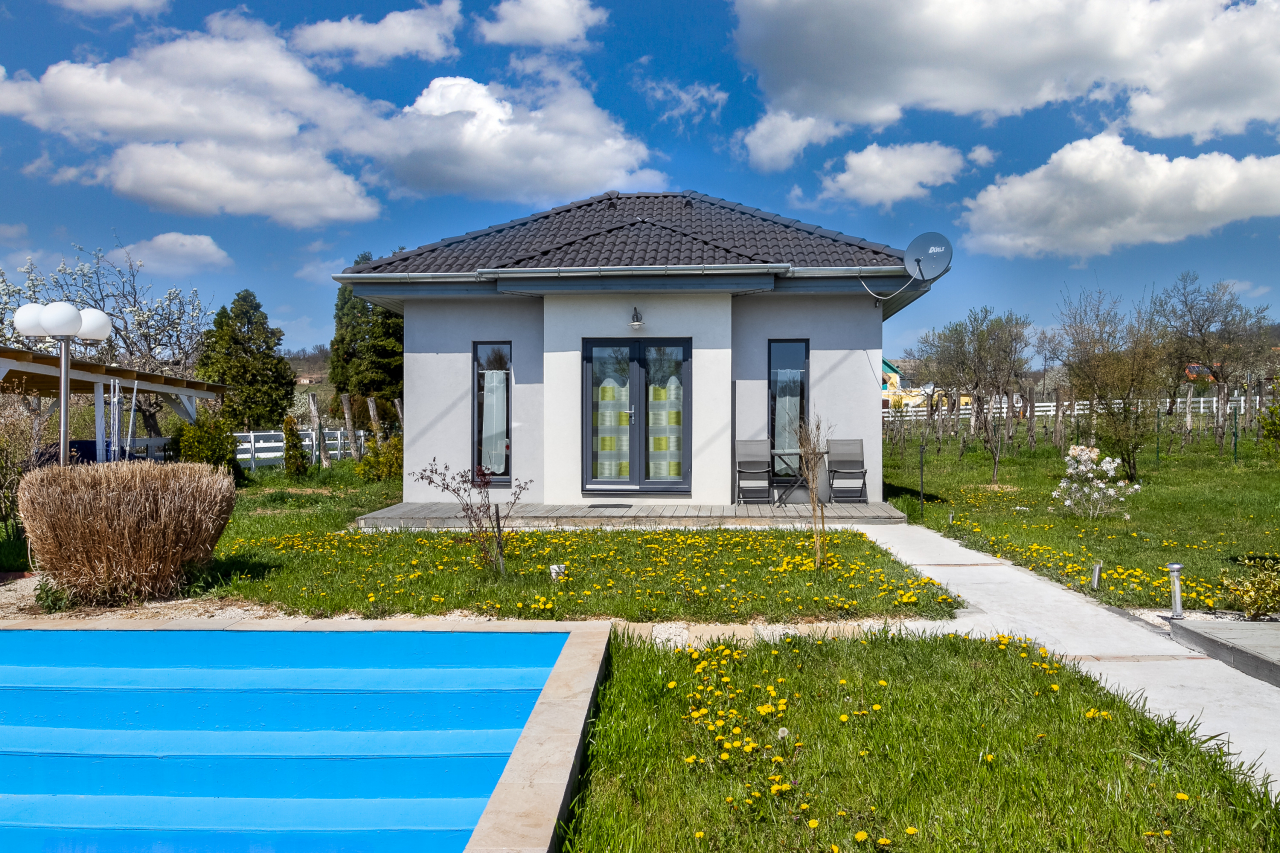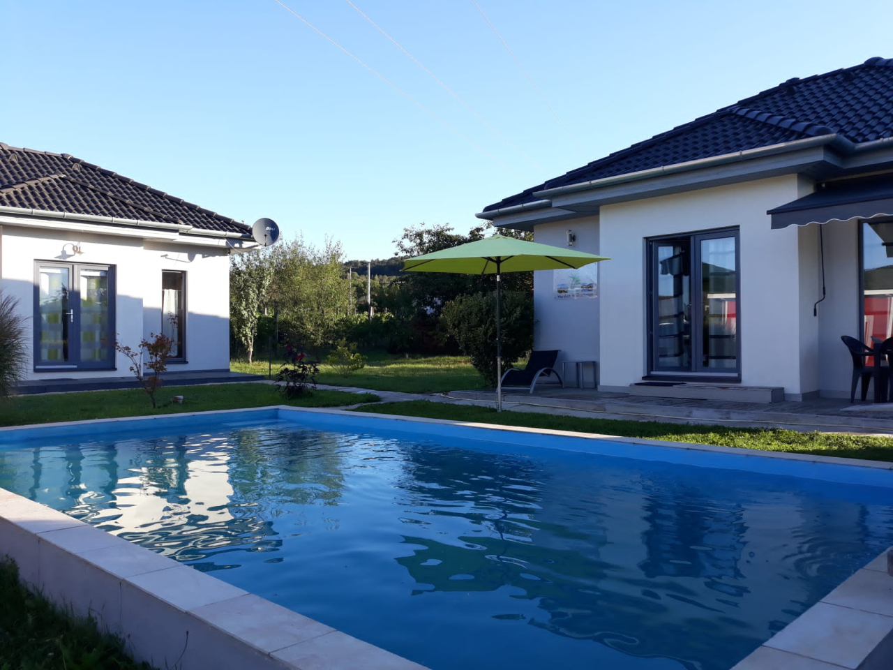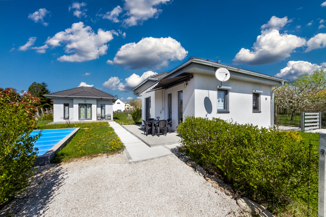 Önálló nyaralóobjektum 2 modern berendezésű nyaralóházzal összesen 6-7 főre ( 4 felnőtt+2-3 gyerek ) csendes, nyugodt helyen nagy medencével. Kert, kerti bútor, TV, mosógép, mosogatógép, autóbeálló, 2 bicikli.