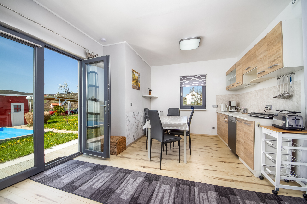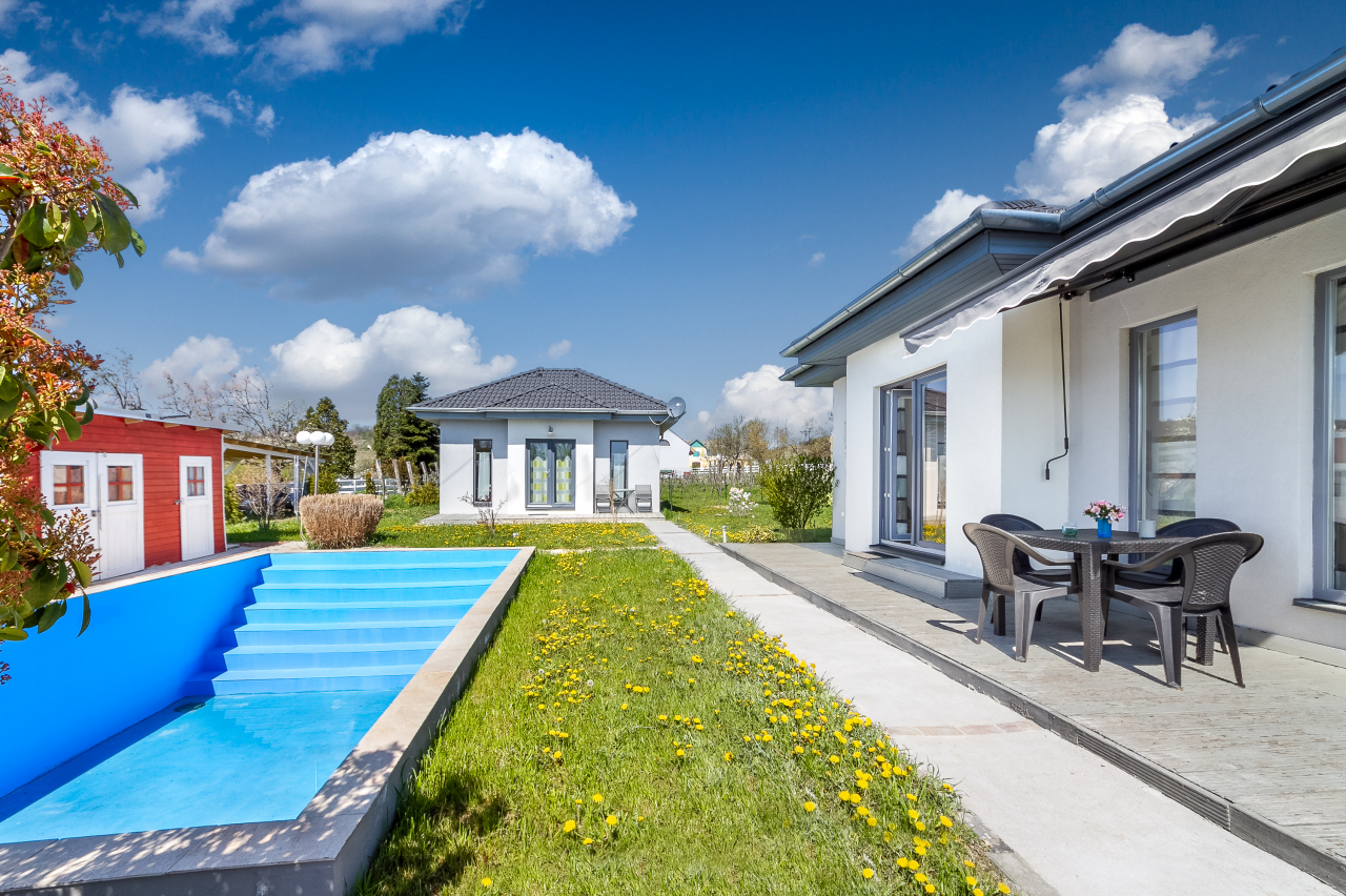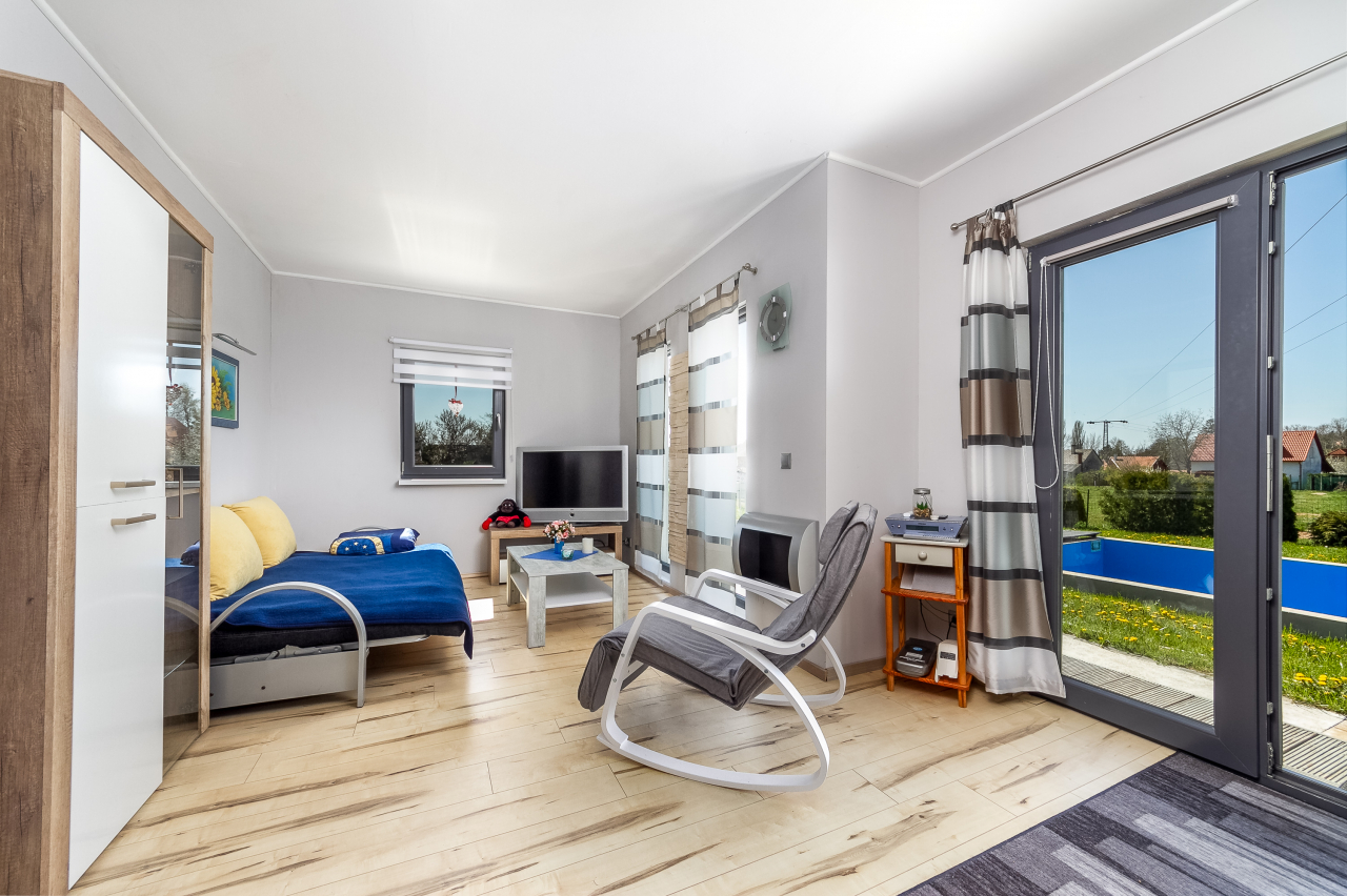 Önálló nyaralóobjektum 2 modern berendezésű nyaralóházzal összesen 6-7 főre ( 4 felnőtt+2-3 gyerek ) csendes, nyugodt helyen nagy medencével. Kert, kerti bútor, TV, mosógép, mosogatógép, autóbeálló, 2 bicikli.