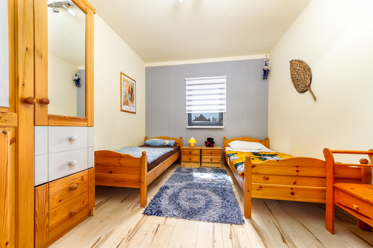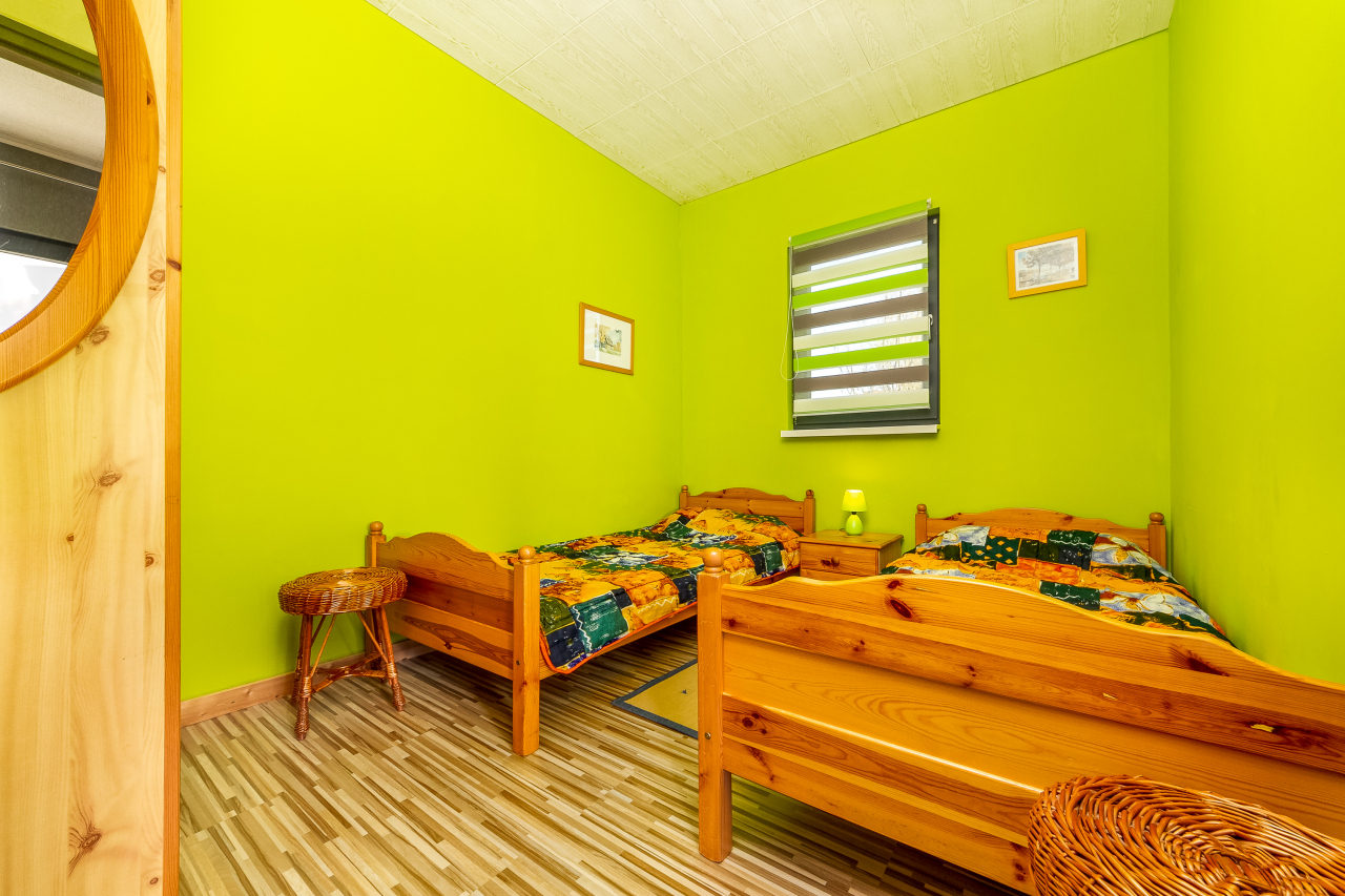 Nagyobb ház 4 főre: tágas nappali-háló ( 2 fekhellyel ) konyhasarokkal, egy kétágyas szoba, zuhanyzó/WC, terasz.