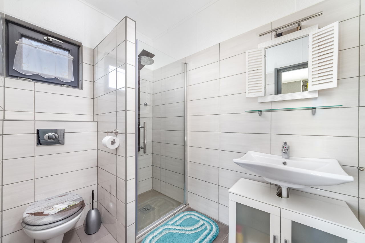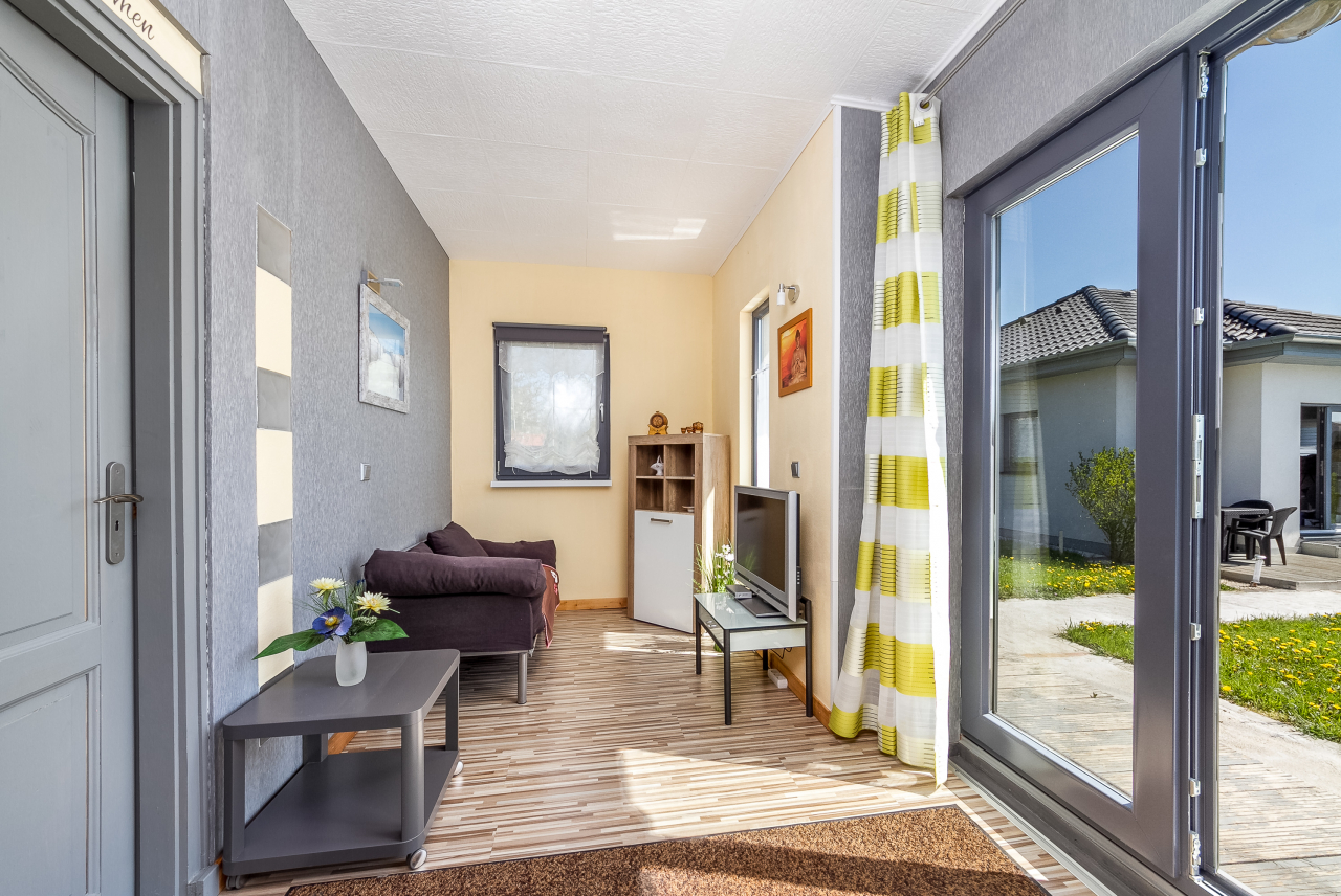 Kisebb ház 2-3 főre: nappali főző- és étkezősarokkal, kanapéval egy gyerek számára, egy kétágyas szoba, zuhanyzó/WC, terasz.