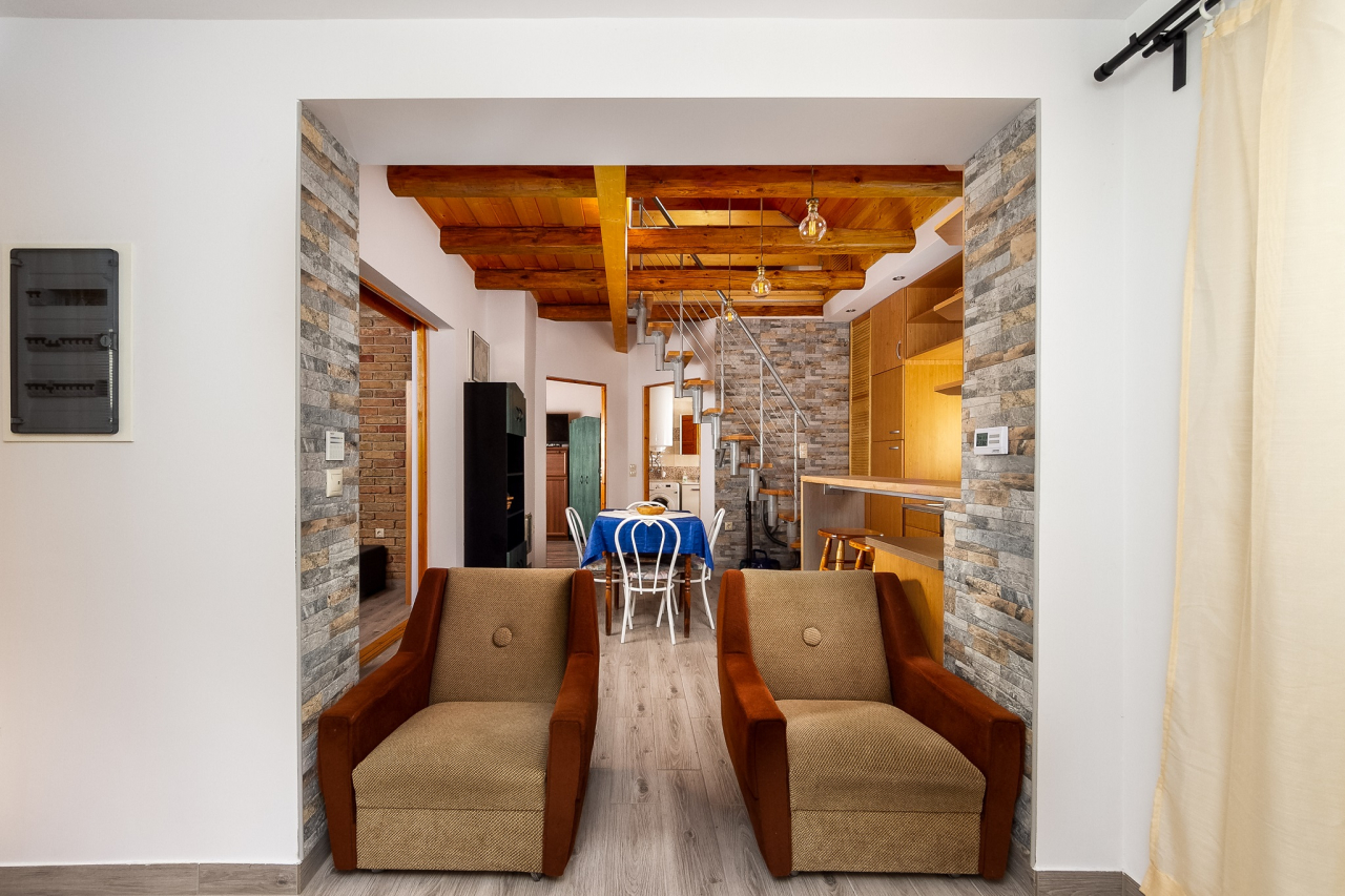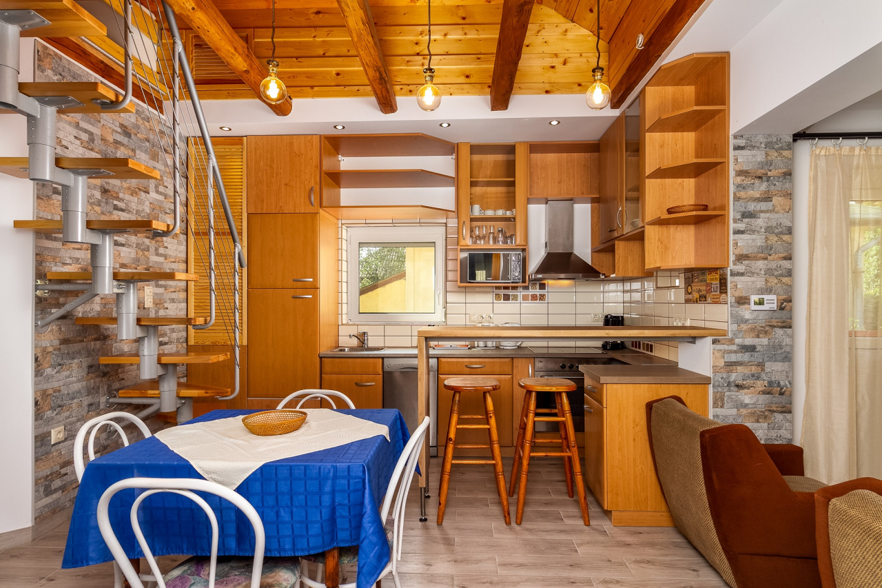 Földszint: Kis nappali konyha-étkezővel, egy kétágyas szoba, egy egyágyas szoba ( kihúzható kanapé ), fürdőszoba ( kád+zuhanyzó )/WC, 2 fedett terasz